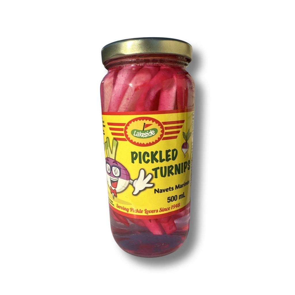 - Pickled Turnips – 12/500mL. Not only do our turnips stand out in colour, they also stand out in taste! Pickled turnips are great in shawarma’s or roast chicken dinners. They also complement gyros, hummus, baba ganoush, and falafels! Add a pop of colour to your shelves and a pop of flavour to your dishes today!